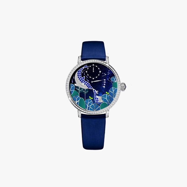 「游林鯨夢(mèng)」腕表采用一刻逆跳技術(shù),透過(guò)分區(qū)蝴蝶翩然起舞呈現(xiàn)時(shí)間軌跡;運(yùn)用3D打印技術(shù),打造唯美漸變星辰;以立體鑲鉆海豚與鹿、多層貝母森林,呈現(xiàn)大自然的生靈之美;時(shí)空交融中,海豚與鹿突破空間束縛,相遇于夢(mèng)幻星空下。